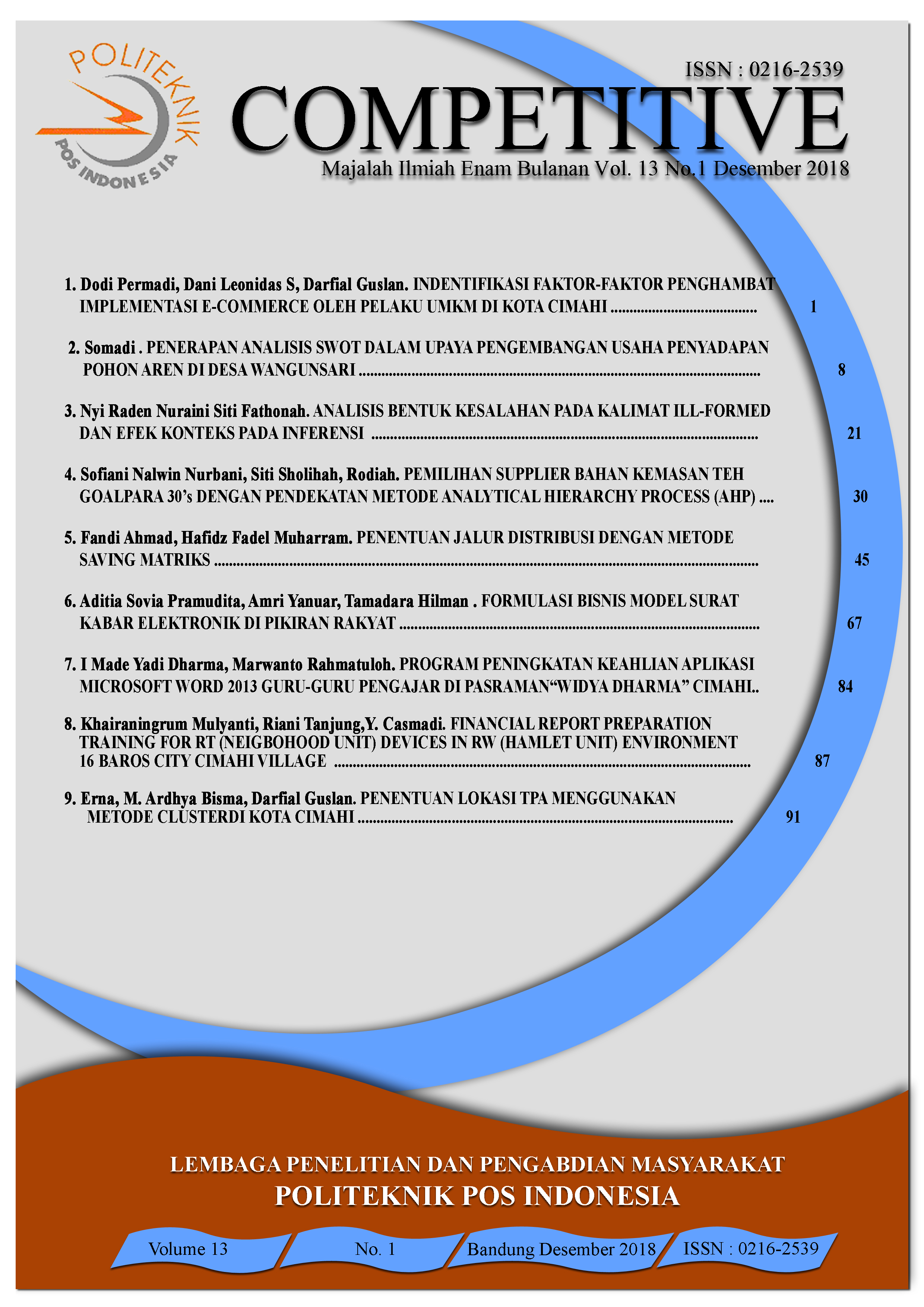Competitive adalah Jurnal ilmiah yang diterbitkan oleh Lembaga Penelitian dan Pengabdian Kepada Masyarakat (LPPM) Politeknik Pos Indonesia yang menerbitkan jurnal hasil penelitian dan hasil pengabdian kepada masyarakat dalam bidang Sistem Informasi dan Teknologi, Logistik, Akuntansi dan Manajemen.